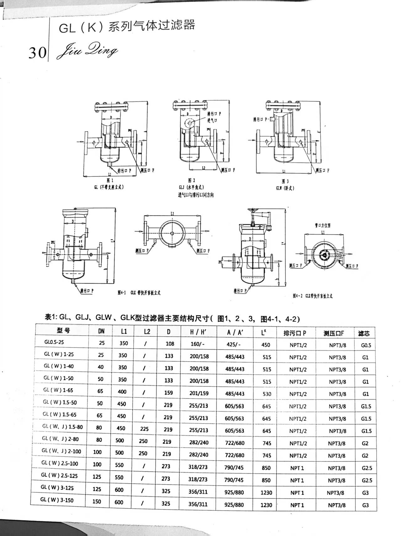 4.& nbsp; For each type of filter in Table 1, the installation type is mainly vertical or ordinary type (without support) under different design pressures. Only when the design pressures are 0.5 and 1.6MPa, the installation type of GL1-GL3 filters is provided with horizontal type (GLW); the type of GL1.5-GL2 filters is provided with horizontal type (GLJ).