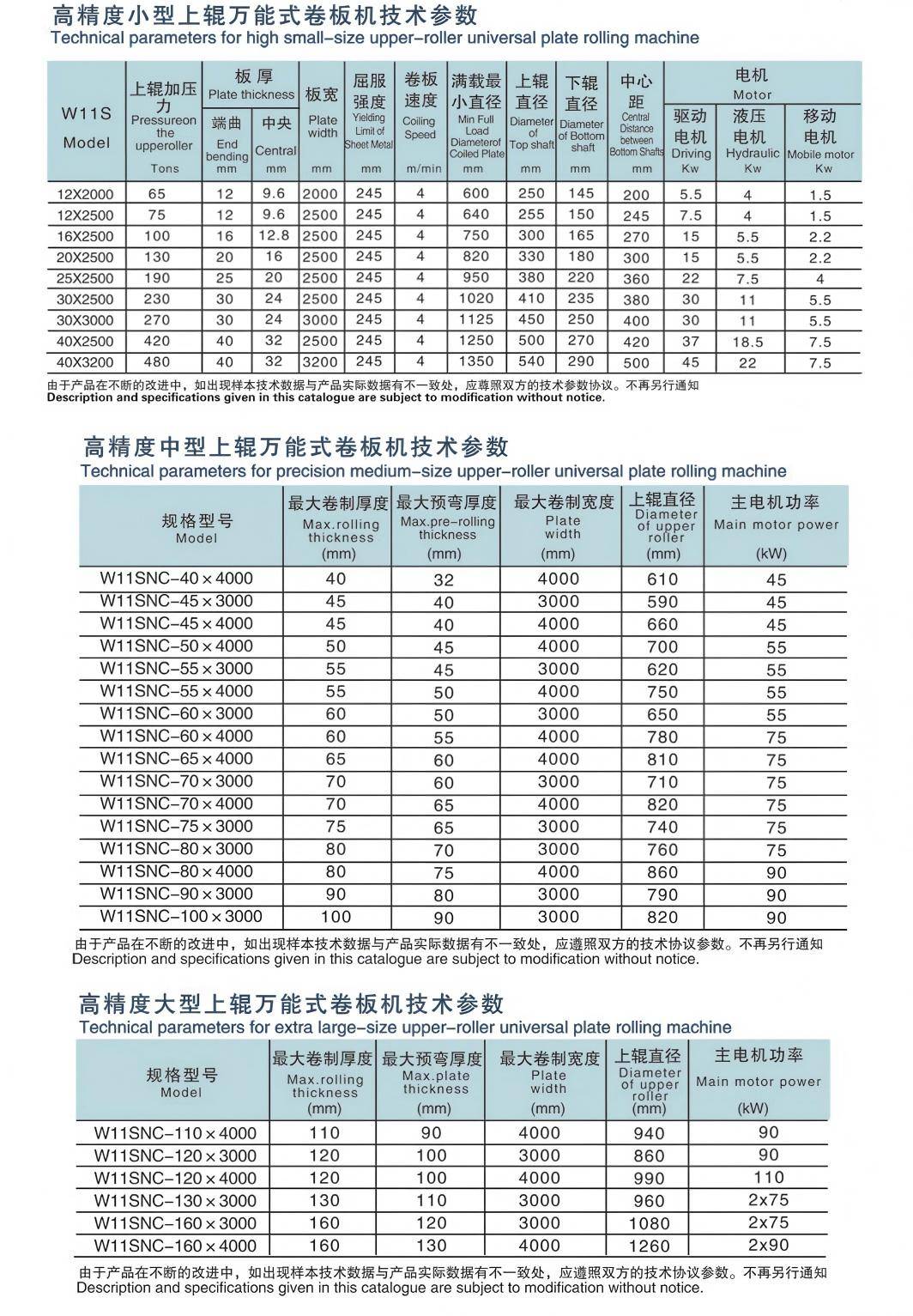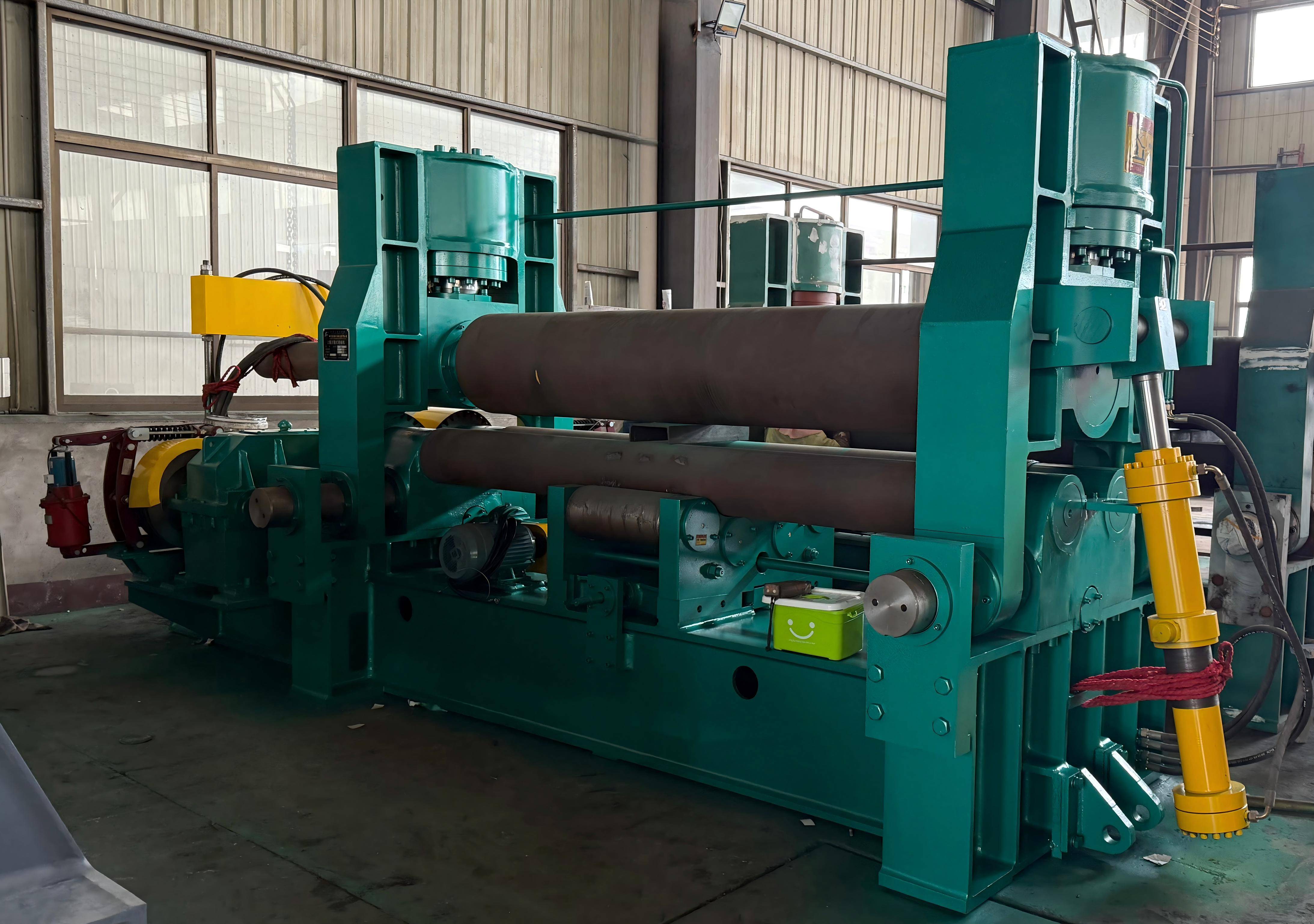 This machine belongs to a hydraulic three-roll plate bending machine. It is used to complete the processes of pre-bending, rounding and straightening of plate ends without turning around after loading carbon steel and low alloy steel for various containers at room temperature. The upper roller can move vertically and horizontally. Pre-bending is achieved by moving the upper roller horizontally so that the upper roller is in an asymmetrical position relative to the lower roller.