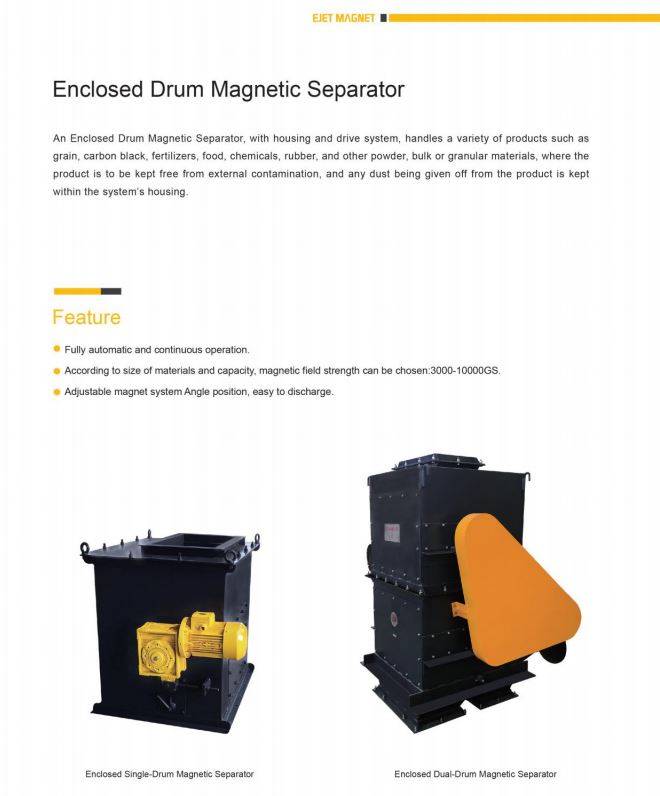 An Enclosed Drum Magnetic Separator,with housing and drive system,handles a variety of products such as grain,carbon black,fertilizers,food,chemicals,rubber,and other powder,bulk or granular materials,where the product is to be kept free from external contamination,and any dust being given off from the product is kept within the system's housing.