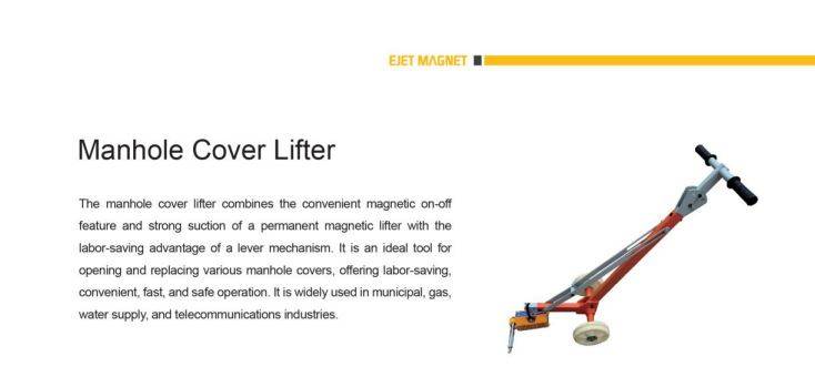 The manhole cover lifter combines the convenient magnetic on-off feature and strong suction of a permanent magnetic lifter with the labor-saving advantage of a lever mechanism.It is an ideal tool for opening and replacing various manhole covers,offering labor-saving, convenient,fast,and safe operation.It is widely used in municipal,gas, water supply,and telecommunications industries.