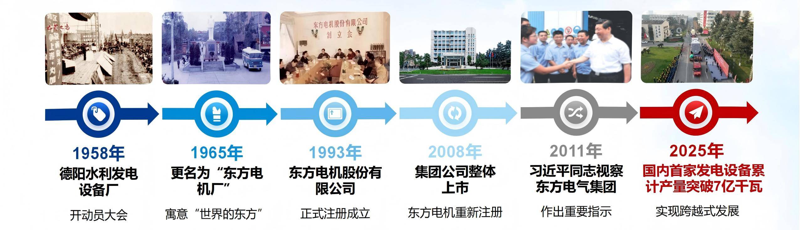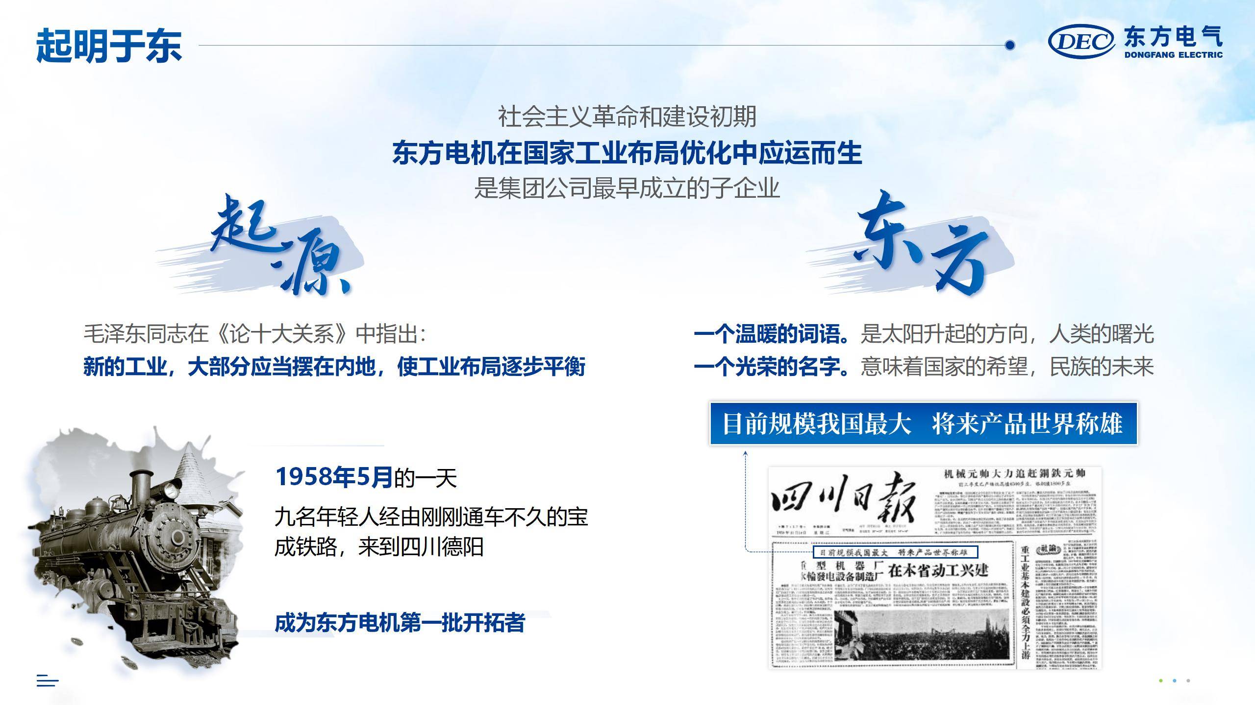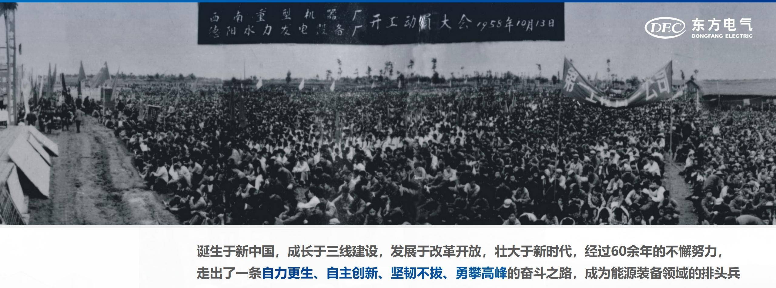 Dongfang Electric Machinery Co., Ltd. was established on October 13, 1958. It is a wholly-owned core subsidiary of China Dongfang Electric Group Co., Ltd., an important state-owned backbone enterprise managed by the central government and involved in national security and the lifeline of the national economy. It is a major technical equipment manufacturing enterprise in my country that studies, designs and manufactures large-scale power generation equipment, and is a major supplier of global power generation equipment, clean energy products and services.