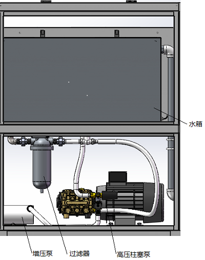 水路系统主要包括:高压柱塞泵、过滤器、增压泵、水箱等。