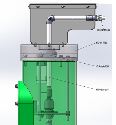 机头组件主要由高压微雾喷嘴、机头旋转组件、机头管路组件以及机头防雨罩组件组成。