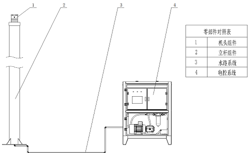 雾桩由机头组件、立杆组件、水路系统、电控系统四部分组成。