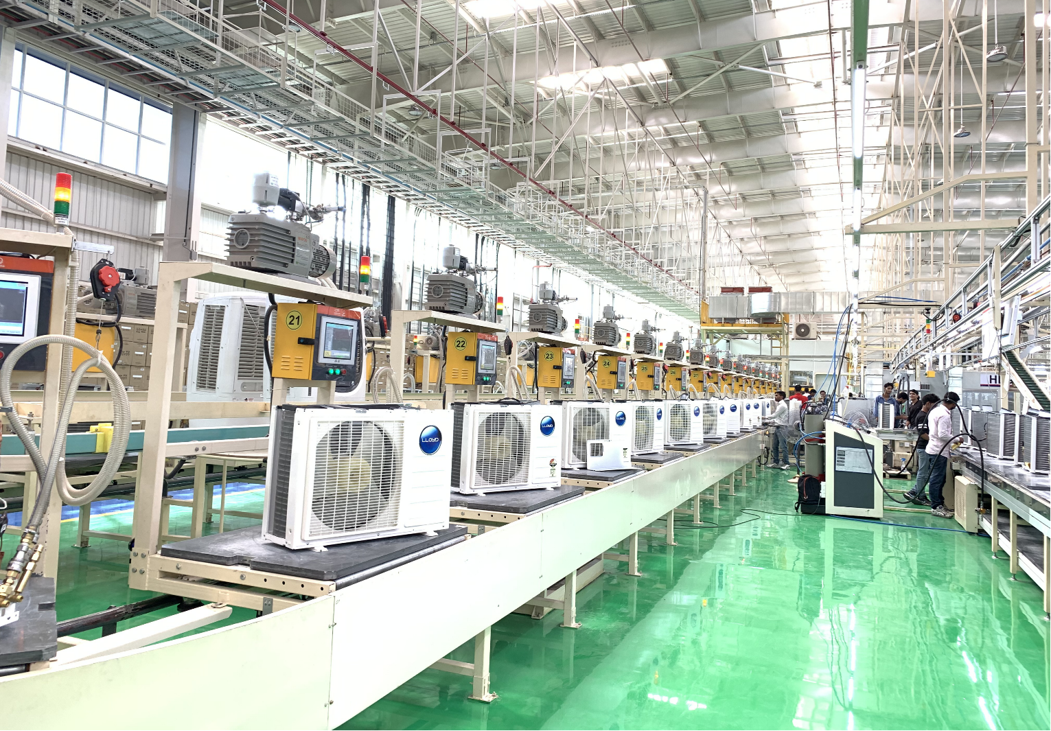 空调生产线,主要有装配、抽真空、冷媒充注、检漏、运行测试和包装等工序;主要输送设备可配置链板线、滚筒线、固定抽空/检测台、环形抽空/检测线;可配置夹抱机、套箱机、套袋机和机器人等自动化装置;可适用R410a和R32冷媒产品。