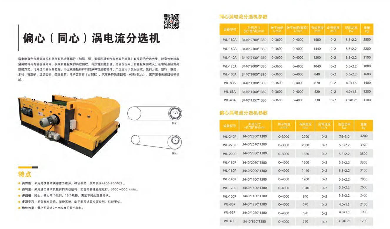 | 涡电流有色金属分选机对各类有色属碎片(如铝、铜、黄铜和其他合金类有色金属)有良好的分选效果,能够有效地将非金属物料与有色金属分离,实现有色金属高效回收,有效增加附加值。是目前应用于有色金属回收及分选领域*经济高效的方式。可分选到铝易拉罐,小至线路板粉碎料的多种粒度的物料。广泛应用于废铝回收、废钢分选、塑料、玻璃、木材、铸造砂、垃圾回收,焚烧底灰,电子废弃物(WEEE),汽车粉碎残渣回收(ASR/ELVS)、废弃家电拆解回收等领域。 特点: • 高性能:采用商性能钕铁确作为磁源,磁场强劲,皮带表面4200-4500GS。 • 高转速:采用进口抽承及独有的传动结构,实现高转速稳定运行,3000-4000r/min。 • 多规格:同心、偏心两个系列,19个规格,满足不同处理量需求。 • 多项专利:拥有分料系统、润滑系统、动平衡系统等多项专利,性能更优。 •绝佳效果:*小可分选2mm粒度的超小物料。 |