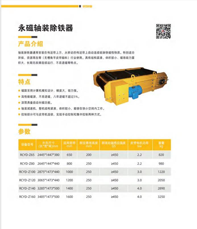 | 永磁轴装除铁器 产品介绍 轴装除铁器通常安装在传送带上方,从移动的传送带上自动连续吸除铁磁性物质。特别适合环保、资源再生等(无槽角平皮带输料)行业使用。 具有结构紧凑、体积较小、磁场吸力面积大、长期无故障连续运行、不易退磁等特点。 特点 •磁路采用计算机模拟设计,梯度大,吸力强。 •高性能磁源,不易退磁,八年退磁不超过5%。 •滚筒具备自动纠偏功能。 •轴装减速机,整机结构紧凑,体积较小,能够在狭小空间内工作。 •控制部分可与皮带机连锁,实现手动控制和集中控制两种方式。 |