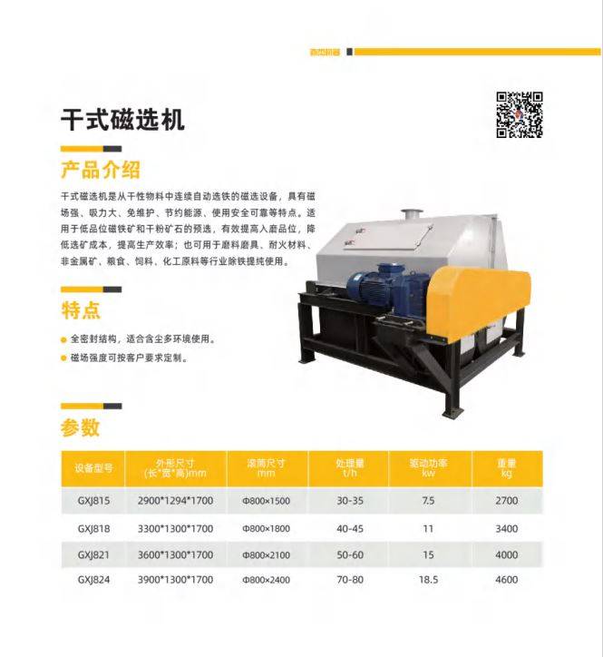 干式磁选机是从干性物料中连续自动选铁的磁选设备,具有磁场强、吸力大、maintenance-free、节约能源、使用安全可靠等特点。适用于低品位磁铁矿和干粉矿石的预选,有效提高入磨品位,降低选矿成本,提高生产效率;也可用于磨料磨具、耐火材料、 非金属矿、粮食、饲料、化工原料等行业除铁提纯使用。