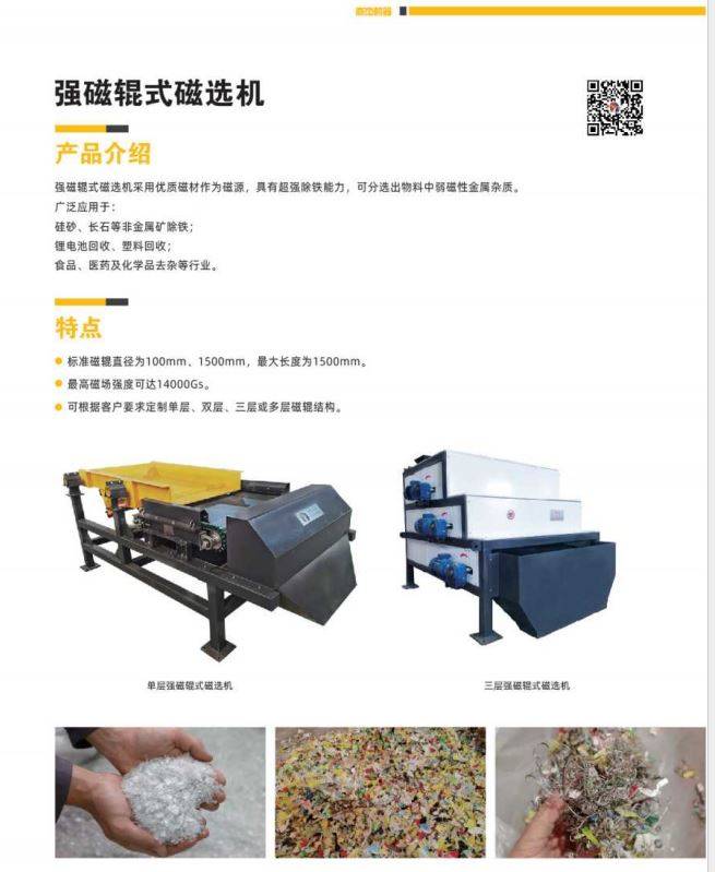强磁辊式磁选机采用优质磁材作为磁源,具有超强除铁能力,可分选出物料中弱磁性金属杂质。 广泛应用于: