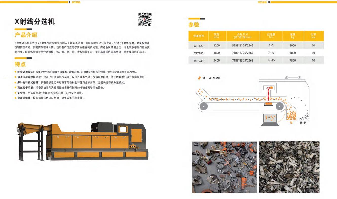 该设备广泛应用于再生铝提纯预处理、有色金属精细分选、垃圾回收等热门再生资 源行业。同时也能够智能分选铅锌、钨、铜、钼、锡、金和锰等矿石,提供高品质的分选结果,显著降低选矿成本。