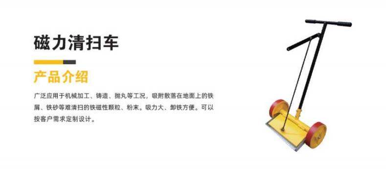 广泛应用于机械加工、铸造、抛丸等工况,吸附散落在地面上的铁 屑、铁砂等难清扫的铁磁性颗粒、粉末。吸力大、卸铁方便。可以 按客户需求定制设计。