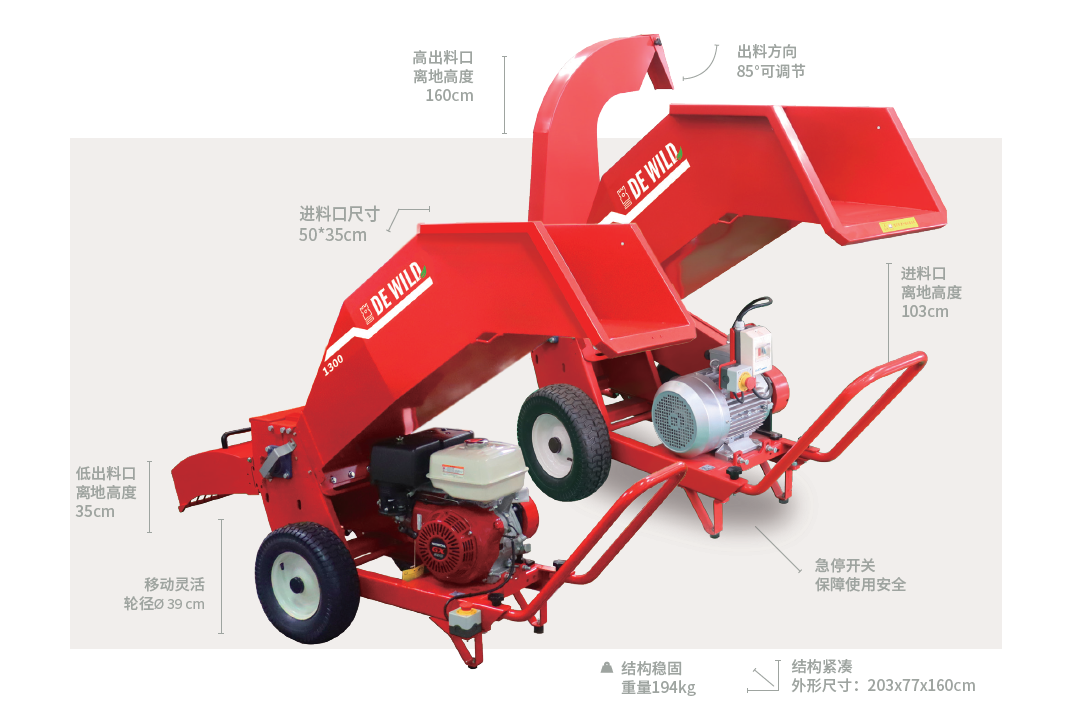 GTS1300C采用高效鼓式切削系统,工作效率因粉 碎物料不同而有所区别,*大粉碎量可达每小时5 立方米。双出料口为GTS1300C多功能款的专利设 计,可粉碎多种物料。高出料斗适用于常规粉碎树 枝(*大直径10cm)及其他干料,粉碎物通过高 出料口喷出,可直接抛入拖车或其他收集箱。低出 料斗适合粉碎常规树枝及含水量大的湿软物料,如 秸秆、藤蔓、新鲜草料等。高低两个出料斗装卸简 单,可实现快速转换。 得益于其紧凑型设计结构,GTS1300C便于运输,可 直接运到作业现场使用,免去拖运树枝的麻烦,粉碎 后的木片可就地处置。基于安全考虑,此款机器配有 按压式急停开关,能使机器立即停止运行。