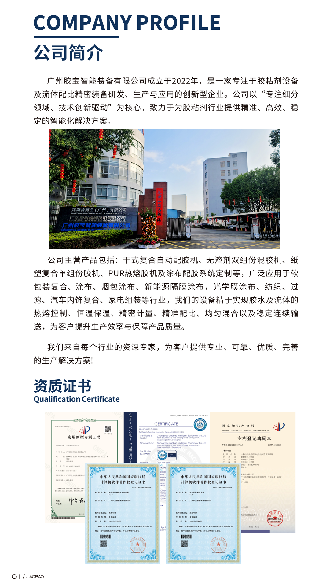 主营产品: 干式复合自动配胶机、无溶剂双组份混胶机、单组份PUR胶机及涂布配胶系统定制