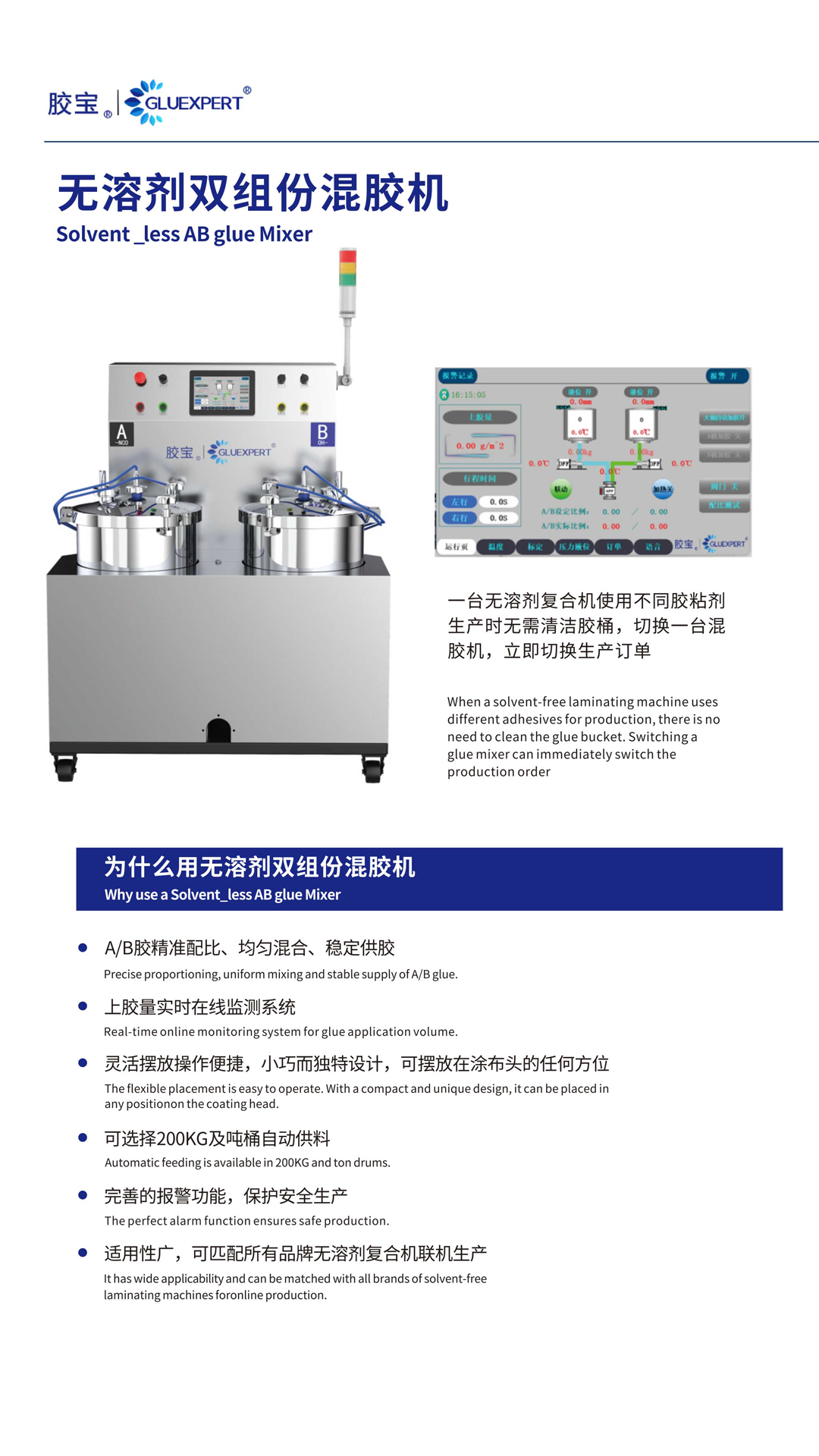 主营产品: 干式复合自动配胶机、无溶剂双组份混胶机、单组份PUR胶机及涂布配胶系统定制