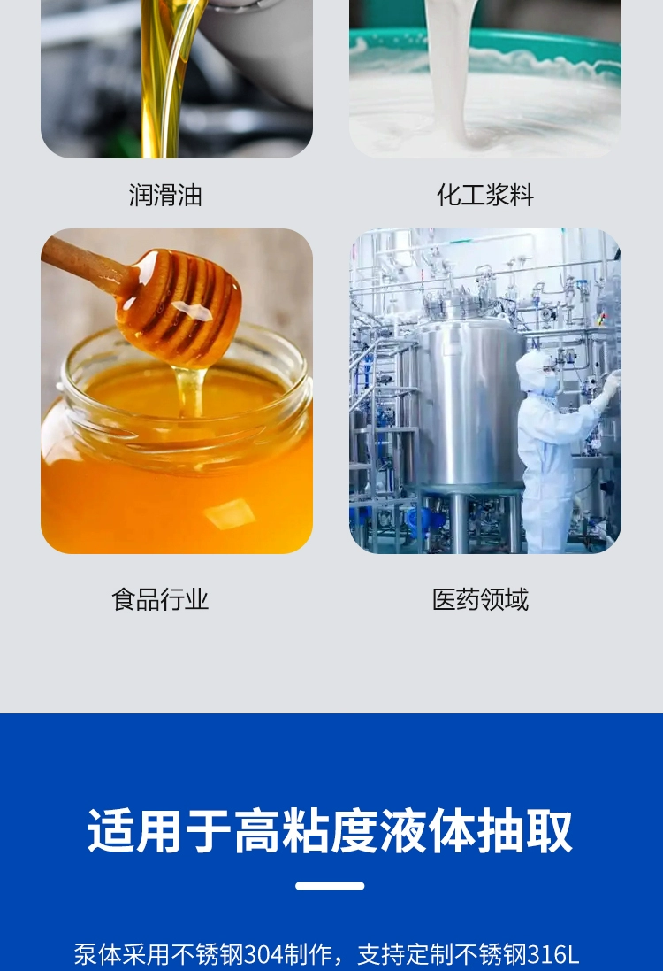 - 医药行业:可用于植物叶茎研磨、各型糖浆、营养液、中成药、膏状药剂、生物制品、鱼肝油、蜂皇浆、疫苗、各种药膏、口服液、针剂及静滴液等的输送。